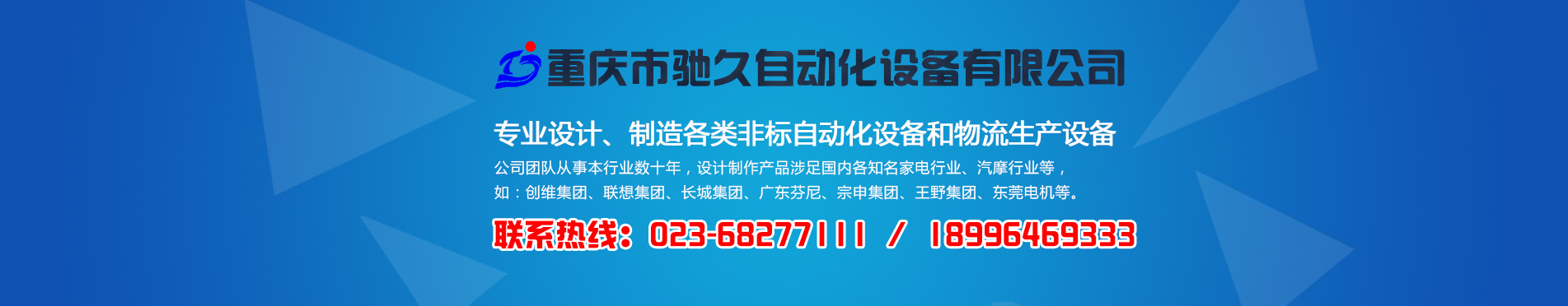 重慶市馳久自動化設備有限公司是一家專業(yè)設計、制造各類非標自動化設備和物流生產(chǎn)設備的綜合性企業(yè)。 公司以“馳而不息,久而彌篤”為發(fā)展理念,堅持“憑誠信獲市場,靠質量得效益”的企業(yè)宗旨,不斷創(chuàng)新理念,持續(xù)發(fā)展技術,為客戶提供滿意的自動化物流系統(tǒng)解決方案和非標自動化設備。 公司生產(chǎn)基地坐落在重慶市北碚區(qū)歇馬鎮(zhèn)天馬村,占地面積約5000平方米。公司擁有先進的加工設備,配套激光切割機、數(shù)控剪板機和折彎機等;同時擁有自動涂裝生產(chǎn)線。 公司團隊從事本行業(yè)數(shù)十年,設計制作產(chǎn)品涉足國內(nèi)各知名家電行業(yè)、汽摩行業(yè)等,如:創(chuàng)維集團、聯(lián)想集團、長城集團、廣東芬尼、宗申集團、王野集團、東莞電機等。 [ 了解更多 ]